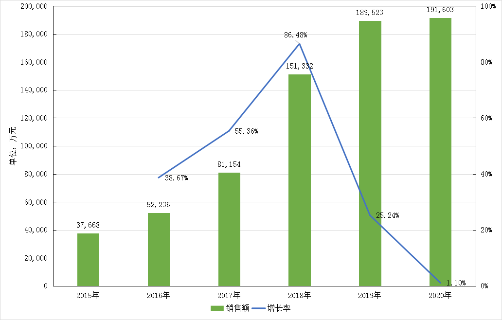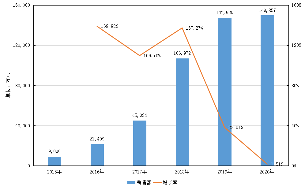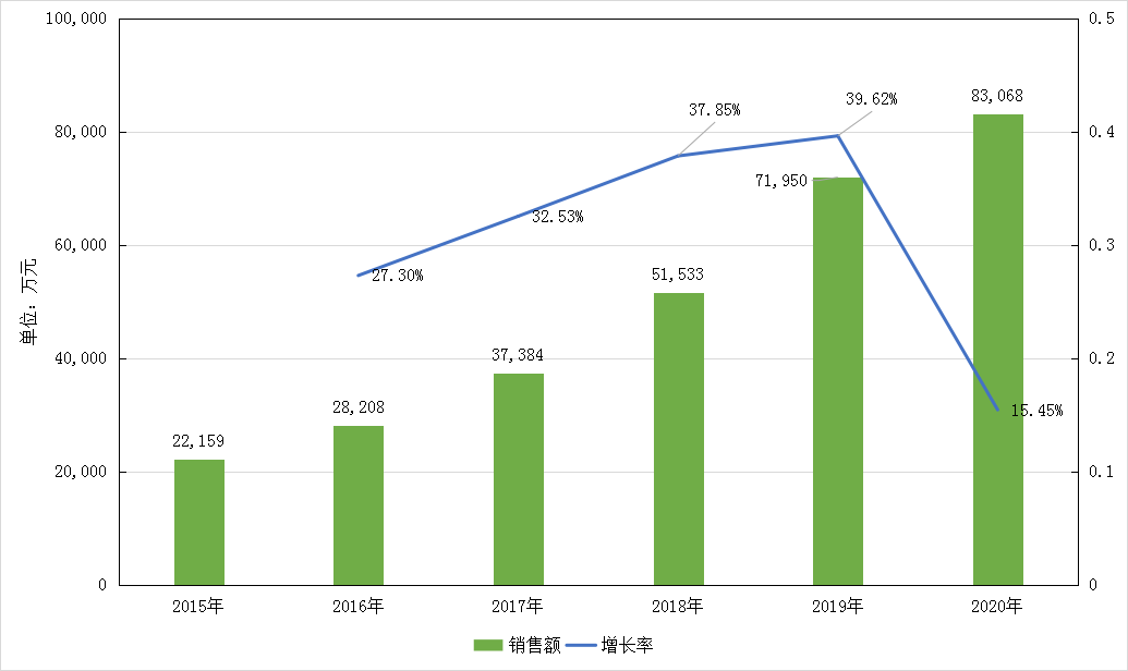 圖4 2015-2020年我國(guó)公立醫(yī)療機(jī)構(gòu)非布司他銷售額及增長(zhǎng)率