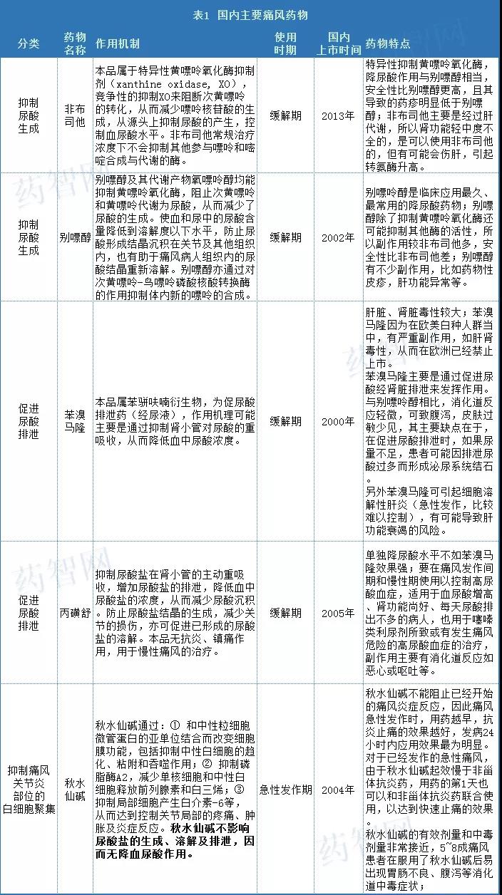 目前國(guó)內(nèi)市場(chǎng)常用的痛風(fēng)藥分別是非布司他、苯溴馬隆、別嘌醇、秋水仙堿和丙磺舒。2019《醫(yī)保藥品目錄》收載非布司他、苯溴馬隆、別嘌醇為乙類,秋水仙堿為甲類,丙磺舒被刪減。