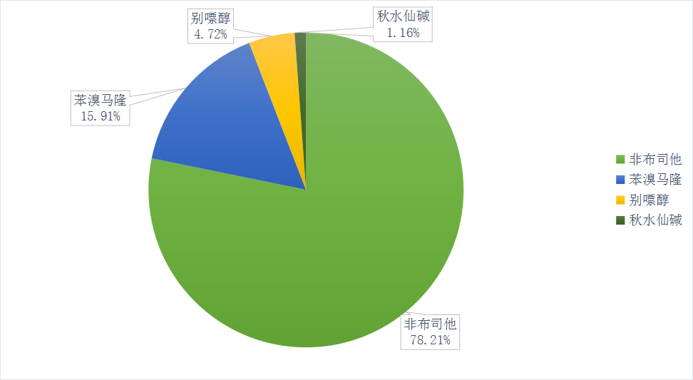 其中,非布司他以78.21%的市場(chǎng)份額遙遙領(lǐng)先,苯溴馬隆占15.91%、別嘌醇占4.72%、秋水仙堿占1.16%的份額。