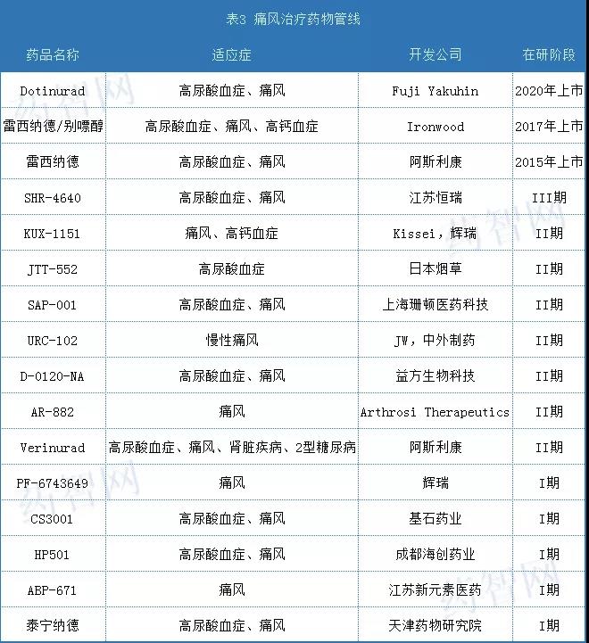 從現(xiàn)有治療痛風(fēng)的研究來看,有些藥物已經(jīng)過臨床證實(shí),具有較好的效果。但現(xiàn)有治療痛風(fēng)的藥物種類仍非常欠缺,數(shù)量有限,且部分藥物副作用明顯,不具備很好的耐受性?,F(xiàn)有處于臨床研究階段的管線也不多(表3)