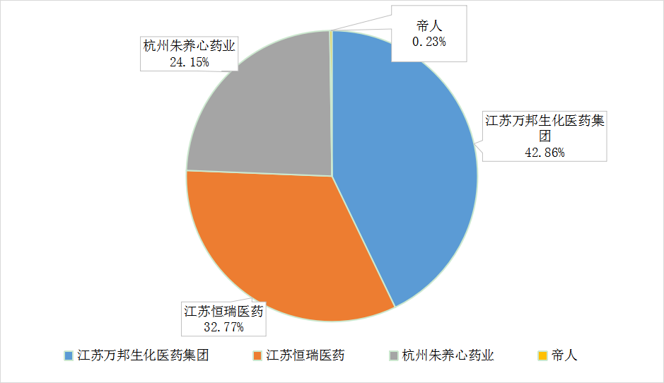 其中,江蘇萬邦生化醫(yī)藥集團(tuán)、江蘇恒瑞醫(yī)藥和杭州朱養(yǎng)心藥業(yè)3家的銷售占領(lǐng)了大部分的非布司他市場(chǎng)。江蘇萬邦生化醫(yī)藥集團(tuán)在2018年超越江蘇恒瑞醫(yī)藥(表2),占據(jù)國(guó)內(nèi)首位,此后市場(chǎng)占有率逐漸拉開差距。