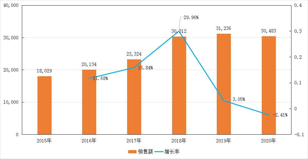 圖6 2015-2020年我國(guó)公立醫(yī)療機(jī)構(gòu)苯溴馬隆銷售額和增長(zhǎng)率