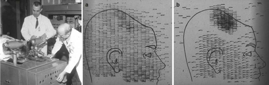 圖8 左:由Brownell和Sweet開(kāi)發(fā)的用正電子發(fā)射的放射性核素對(duì)腦瘤進(jìn)行定位的多探頭儀器。右:該掃描儀的圖像顯示了腦瘤的存在(圖像b)。1966年,在布魯克海文國(guó)家實(shí)驗(yàn)室,山本等人開(kāi)發(fā)了第一個(gè)用于大腦成像的圓形探測(cè)器陣列,由于其形狀,被昵稱(chēng)為“縮頭烏龜”或“吹風(fēng)機(jī)”。20世紀(jì)60年代,David Kuhl和Roy Edwards開(kāi)發(fā)了一臺(tái)核醫(yī)學(xué)斷層成像設(shè)備,并提出了縱向和跨軸斷層成像的概念。這臺(tái)機(jī)器是現(xiàn)代SPECT系統(tǒng)的前身,證明了斷層成像在核醫(yī)學(xué)中的作用。Godfrey Hounsfield接著開(kāi)發(fā)了用于射線攝影的橫軸斷層攝影,這有助于正電子發(fā)射斷層攝影(PET)的發(fā)展。Ter-Pogossian、Phelps和Hoffman于1975年開(kāi)發(fā)了一臺(tái)采用濾波背投的PET儀器。