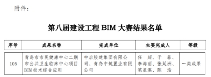 喜報!青島市市民健康中心二期市公共衛(wèi)生臨床中心項目榮獲第八屆全國建設(shè)工程 BIM大賽一類成果