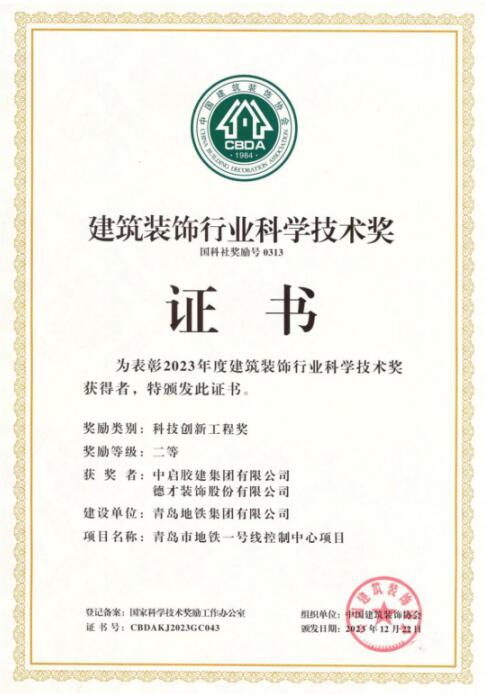 12月15日,中國建筑裝飾協(xié)會公布了2023年度中國建筑裝飾行業(yè)科學技術獎獲獎名單。由中啟膠建集團膠州公司建設的青島市地鐵一號線控制中心項目榮獲中國建筑裝飾行業(yè)科學技術獎(科技創(chuàng)新工程獎)二等獎。這是我公司首次獲得該獎項,創(chuàng)中啟膠建集團技術創(chuàng)新領域的先河。