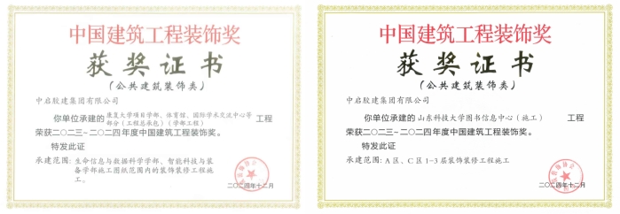 大會發(fā)布了2023年度中國建筑裝飾協(xié)會行業(yè)綜合數(shù)據(jù)統(tǒng)計(jì)報(bào)告,并頒發(fā)了2023-2024年度第一批中國建筑工程裝飾獎。中啟膠建集團(tuán)建筑七公司承建的康復(fù)大學(xué)項(xiàng)目學(xué)部、體育館、國際學(xué)術(shù)交流中心等部分(工程總承包)(學(xué)部工程);建筑九公司承建的山東科技大學(xué)圖書信息中心(施工)兩個(gè)項(xiàng)目入選。